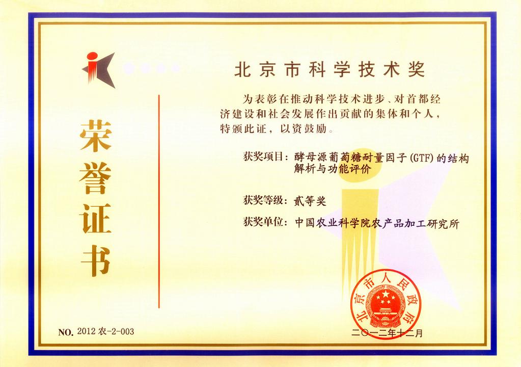 | ------来源:中国农业科学院农产品加工研究所     近日,由中国农业科学院农产品加工研究所吕加平研究员主持完成的 “酵母源葡萄糖耐量因子(GTF)的结构解析与功能评价”荣获2012年北京市科技进步二等奖。该项目成果获授权发明专利1项,在Agricultural and Food Chemistry、Biological Trace Element Research等期刊公开表论文9篇(SCI收录论文共3篇)。     该研究通过温和溶剂提取、分子筛与膜组合分离及ICP-AES/MS分析,确证从GTF高产酵母中分离获得了两种含铬物质,其中GTF为小分子含铬物质,并通过红外光谱、质谱等技术对GTF进行结构解析。Ⅱ型糖尿病模型鼠试验表明:GTF酵母菌粉可显著降低糖尿病小鼠总胆固醇和甘油三酯含量,高剂量的GTF酵母可显著降低糖化血红蛋白;对胰腺组织和β细胞有一定保护作用。该研究成果是继2012年成果鉴定“葡萄糖耐量因子高产酵母菌株选育及制备技术研究”基础上进一步的深化。     目前,我国糖尿病患者居全球之冠,达到了9240万以上。GTF作为生物来源含铬物质,机体吸收率高、安全性好,副作用低。GTF不仅可作为糖尿病的辅助治疗制剂,还可作为糖尿病人的保健食品。本项成果为酵母源GTF作为补铬营养强化剂及保健食品配料的深度开发提供了重要理论依据。同时,本项目中的高GTF酵母制备技术可在保健食品、制药、饲料添加剂等企业转化应用,开发形式多样的保健品中间原料或终端产品,如富含GTF菌体的胶囊、口嚼片、口服液等,使其成为糖尿病患者及潜在高危人群营养保健补铬制剂或糖尿病辅助治疗制剂。