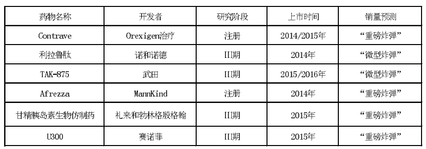 赛诺菲的重组甘精胰岛素U300,将于2014年上半年在美国和欧洲提交新药上市申请。和来得时相比,该产品的低血糖发生率更低,皮下注射量更小,而来得时将在2015年失去专利保护。作为全球最大的胰岛素厂家,诺和诺德希望能从赛诺菲手中夺回市场份额,但可能需要等到该公司长效胰岛素新药Tresiba于2016年在美国获得批准上市才可能实现这一愿望。