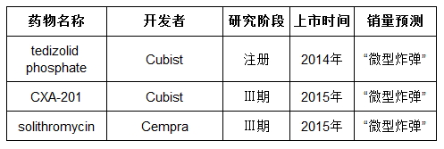 Cubist制药公司在2013年收购Trius和Optimer公司后,将自身定位为“抗感染的药物开发的领航者”。受益于美国抗生素发明激励法案(GAIN Act),Cubist公司的新一代恶唑烷酮抗菌剂tedizolid phosphate获得快速审批资格,并于今年10月向FDA提交了用于治疗急性细菌性皮肤和皮肤结构感染适应证上市申请,目前正在测试其治疗严重的革兰氏阳性菌感染,包括耐甲氧西林金黄色葡萄球菌(MRSA)的疗效。该药物将与辉瑞的Zyvox一争高下。瑞士信贷预测,tedizolid phosphate到2020年销量一般,约为2亿美元。