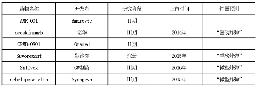 Synageva生物制药公司的sebelipase alfa用于治疗罕见疾病沃尔曼氏病,现已进入Ⅲ期临床试验阶段。患沃尔曼氏病的婴儿大部分无法存活1年以上,成人患者有腹部肿胀、肝脏肿大和严重的甚至危及生命的消化问题。sebelipase alfa将成为第一个获得批准用于治疗沃尔曼氏病的药物,FDA已经授予其罕见疾病药物、快速审批和“突破性疗法”认定资格。鉴于罕见疾病的定价环境,Synageva公司能够在此药上获得丰厚的回报。